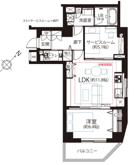 | 間取内容 | LDK11.8帖 洋室6.4帖 S5.1帖 | ||