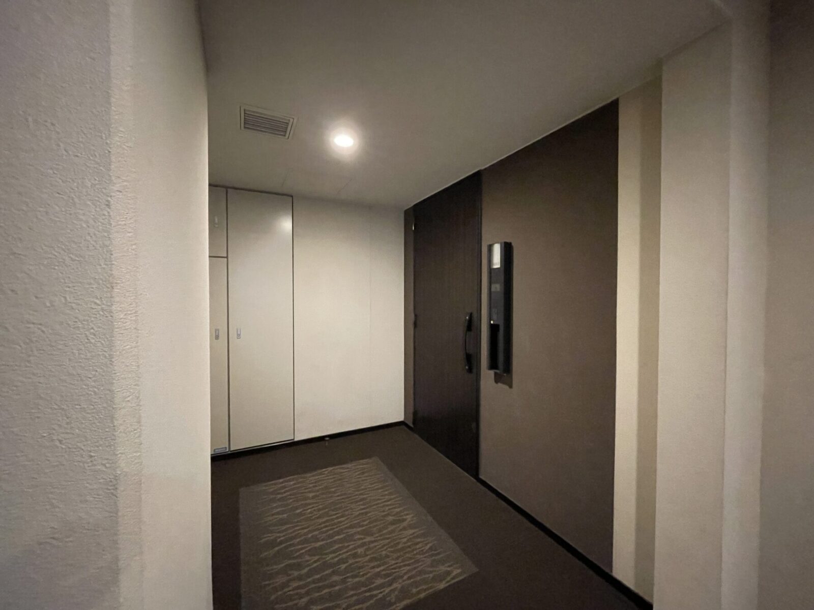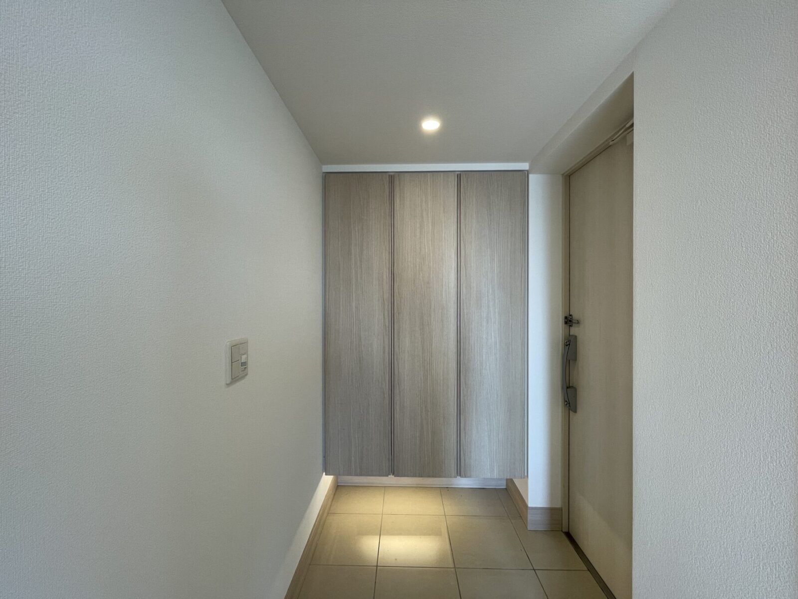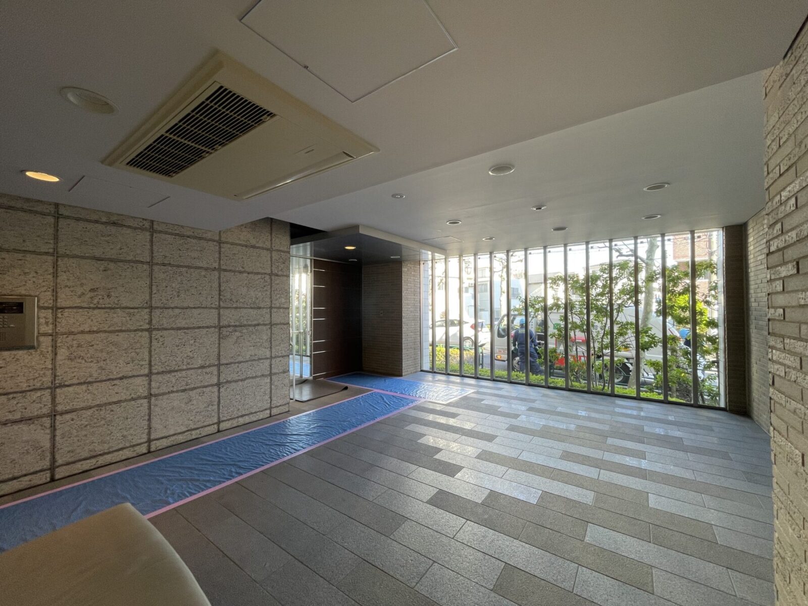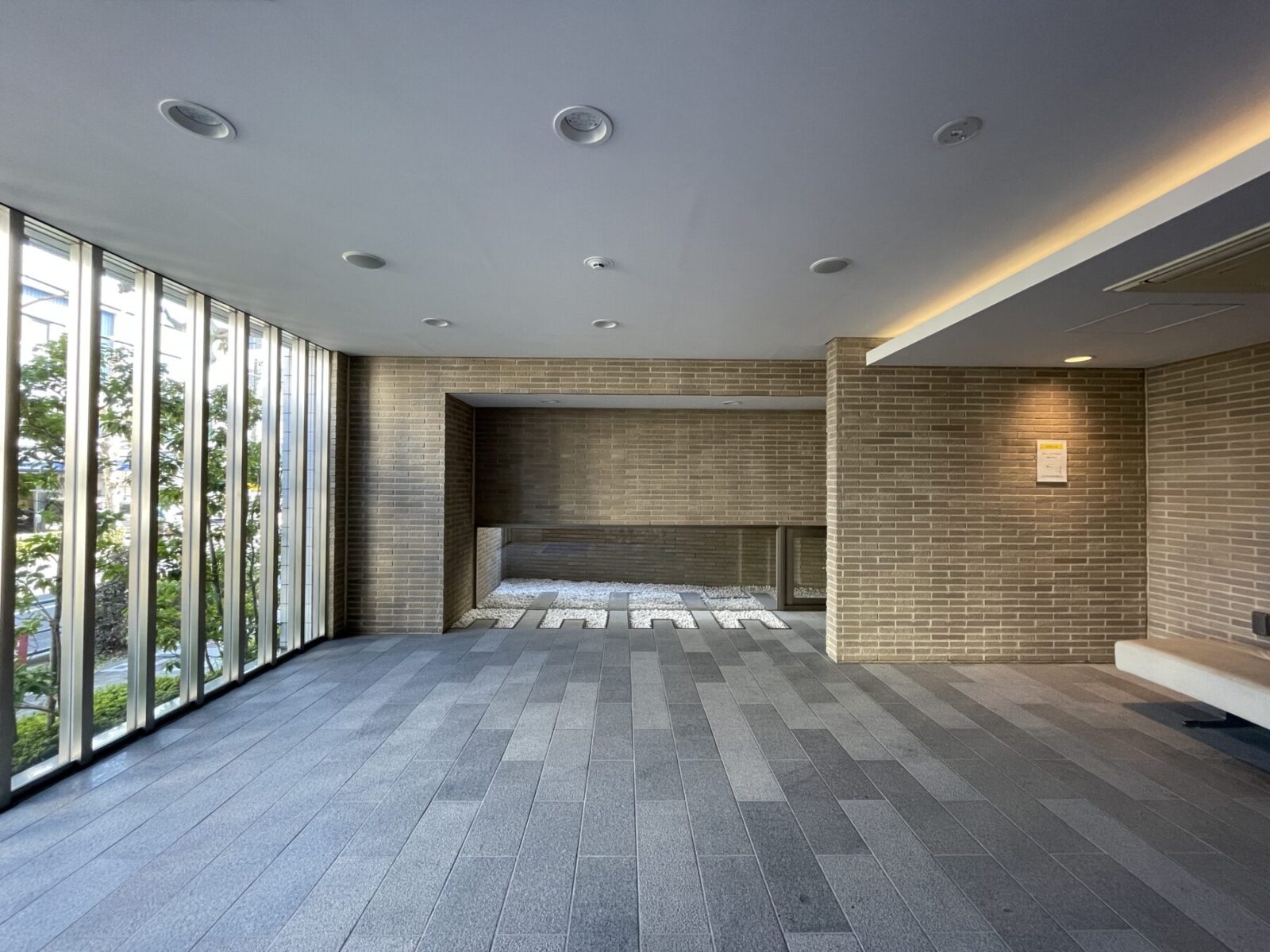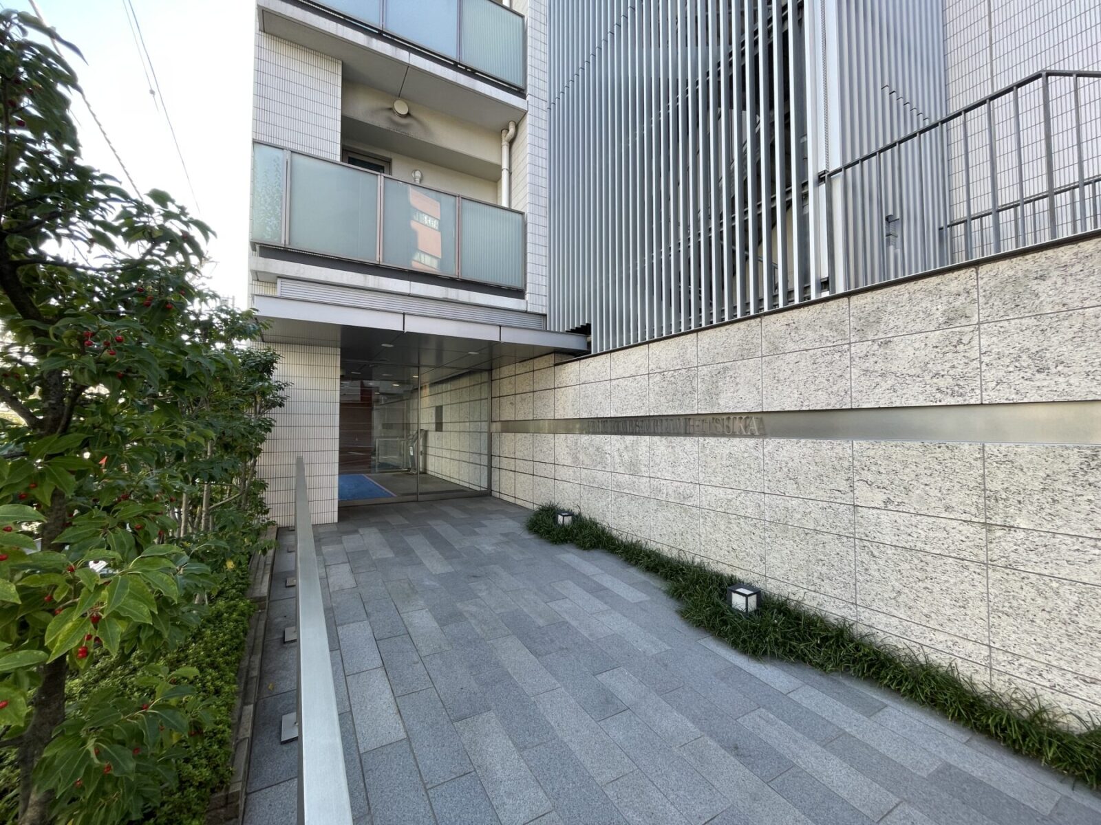 アプローチとエントランスホールでは同じ御影石を敷き、