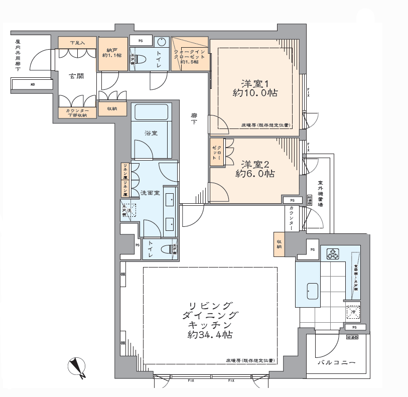 | 間取内容 | LDK34.4帖 洋室10.0帖 洋室6.0帖 | ||