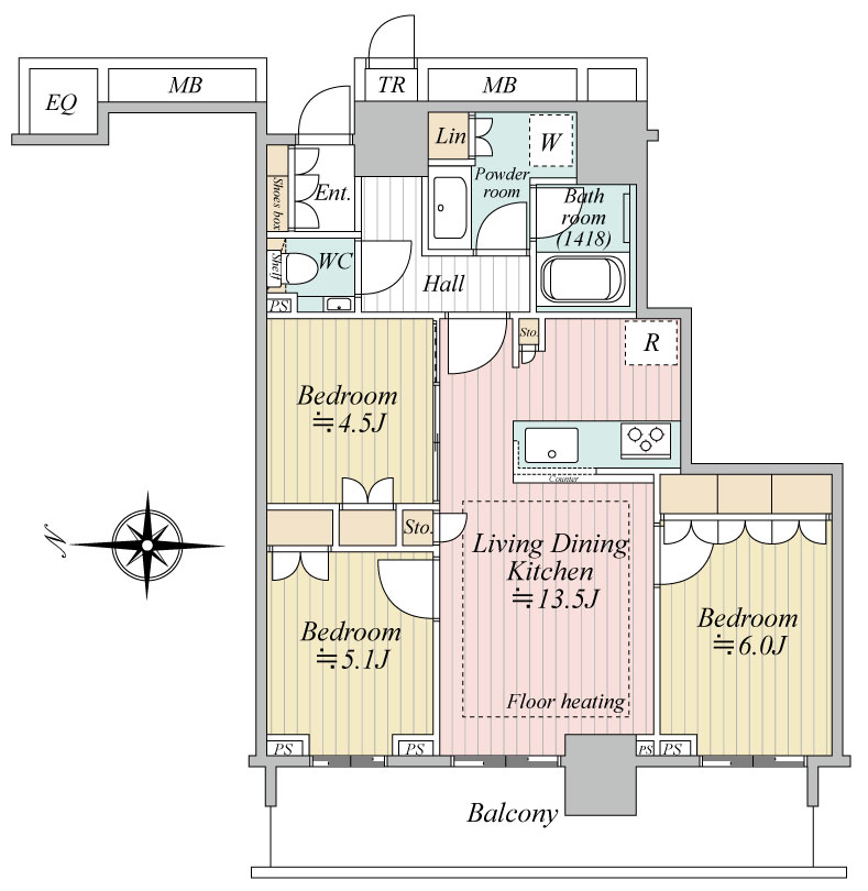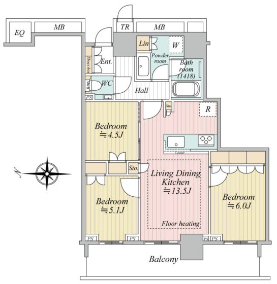 | 間取内容 | LDK13.5帖 洋室6帖 洋室5.1帖 洋室4.5帖 | ||