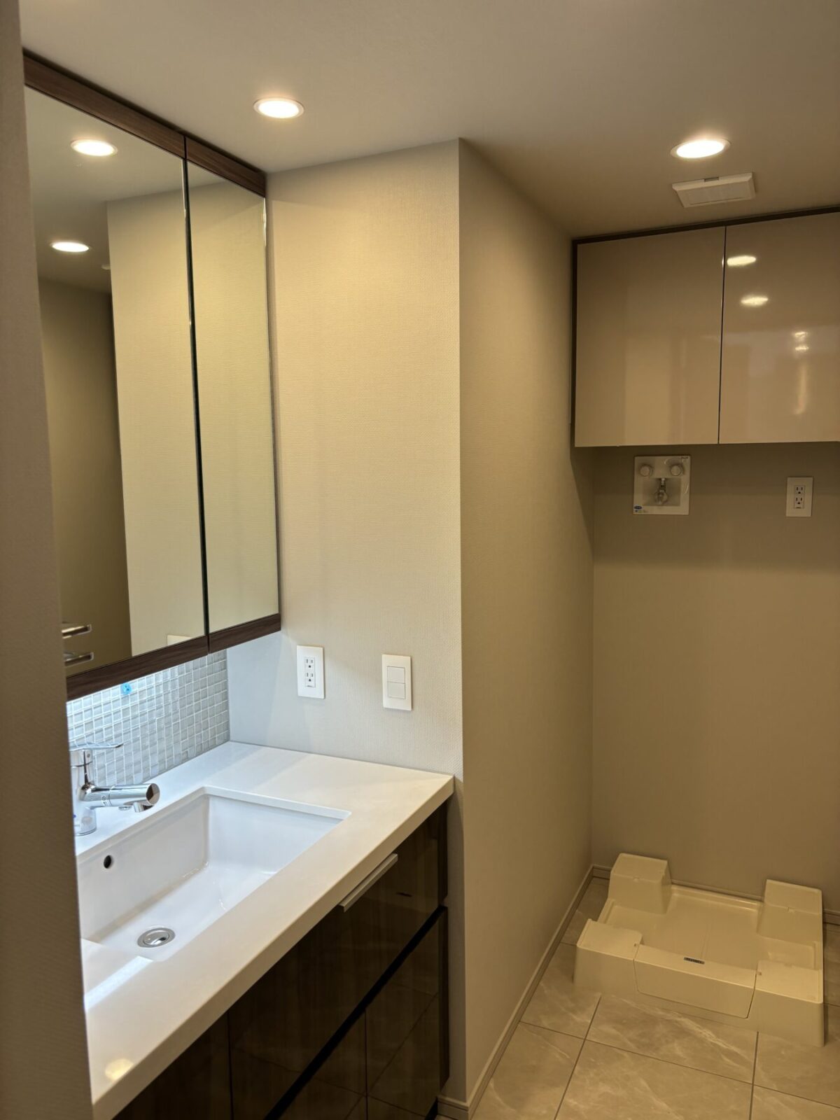 三面鏡裏や洗濯機置き場の吊り収納は化粧品やリネンがすっきり収まります