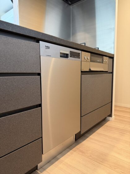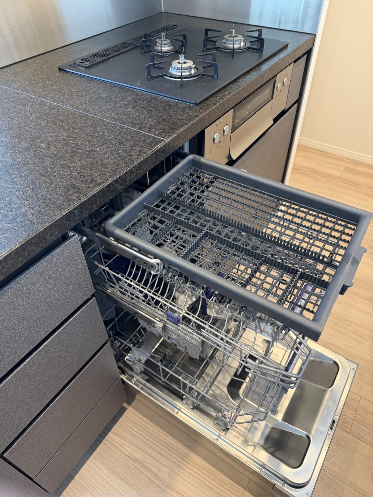 食洗器は鍋も入る大容量で、200Vのため予洗も不要