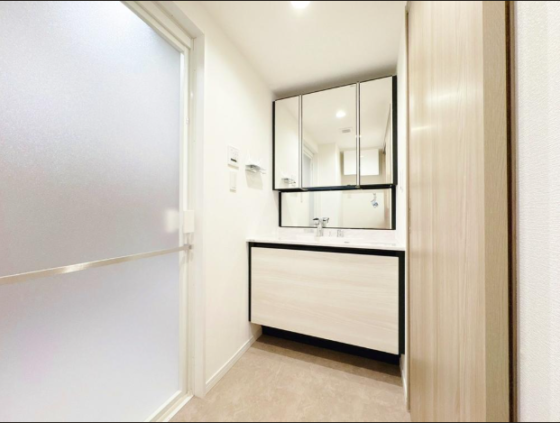 ■洗面室 :LIXIL洗面化粧台W1000、三面鏡、 タッチレス水栓、タッチレススイッチ 吊戸棚、洗濯用防水パン、洗濯水栓