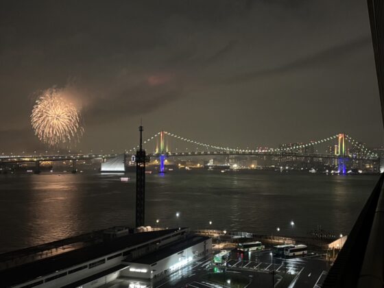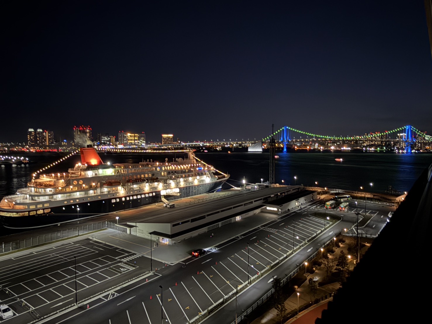 レインボーブリッジと豪華客船を望みます。